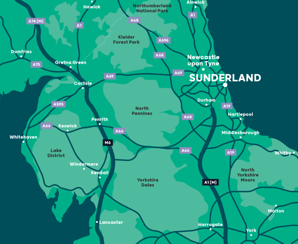 Sunderland is well-connected by road, with easy access to the A19 and A1(M). Rail services provide quick connections to Newcastle, Durham and Teesside and a direct connection to London – a comfortable and convenient route to the capital in under four hours.